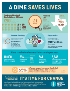 Alcohol use is one of the biggest threats to the health and safety of Texas kids, and the earlier kids start, the greater the risk. Teens who drink before age 15 are four times more likely to struggle with alcohol problems later in life. Early drinking can affect school work, harm health, and set kids on a dangerous path — but we can stop that from happening.